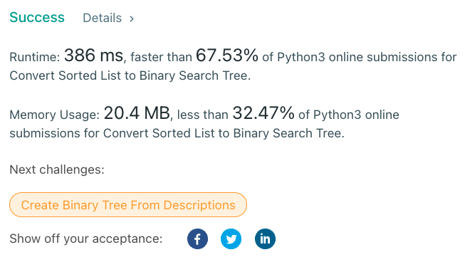 푸는 방법은 여러 가지가 있을거같은데 AVL트리 ADT를 만들어서 인풋을 다 넣어줘도 되고 (근데 평소에 avl트리를 빨리 구현할 수 있을 정도로 많이 만들어본게 아니라면 비효율적이겠지?) 링크드리스트에서 값을 다 가져와서 리스트를 만들어놓고 median을 부모노드로 트리를 만드는 과정을 재귀적으로 수행해도 될거같다. 근데 후자의 방법은 메모리를 많이먹긴함. 상수조건 보니까 인풋은 최대 20000개. 메모리 문제는 없을거같긴한데 만약 면접관이 공간복잡도를 물어보고 줄여보라고 하면 어떡하지?ㅋㅋ.. 일단 정답 맞추고 생각해볼까