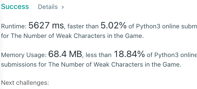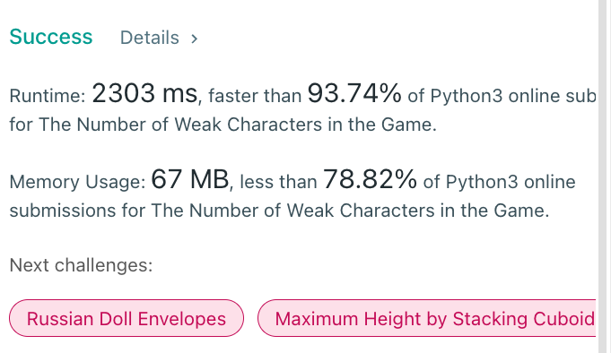 2. attack이 젤 큰놈들 중에 defense가 젤 큰놈의 값이 10이라고 치자(예를 들어). 그럼 어쨌든 attack이 걔보다 작은놈들은 defense가 10보다 작을때 무조~~건 weak이다. 그니까 max값을 갱신해서 저장을 해놓는거고 만약 max값이 더 큰게 나타나면 주저없이 갱신하면 된다. 왜냐하면 defense는 오름차순 정렬이라서 attack이 같을때에는 if d < curr_max조건에 걸일 일이 없음. 현재 보고 있는 애의 defense값보다 더 큰 애가 있고 걔가 attack값도 더 커야만 저 조건에 걸린다는 것.