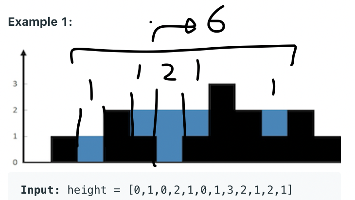 물은 두 높이중 더 낮은 높이까지만 차는게 최대이므로 min(leftmax(i), rightmax(i))가 현재 i에서 물이 차오를 수 있는 최대 높이다.