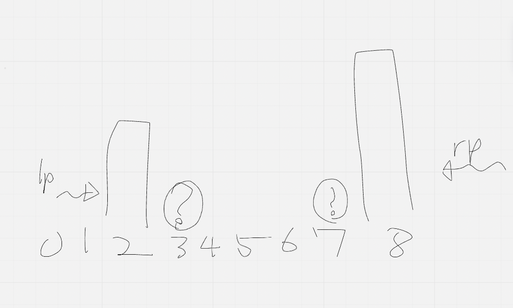 lp를 2까지 움직이고 rp를 8까지 움직여서 leftmax,rightmax값을 갱신했다고 치자.