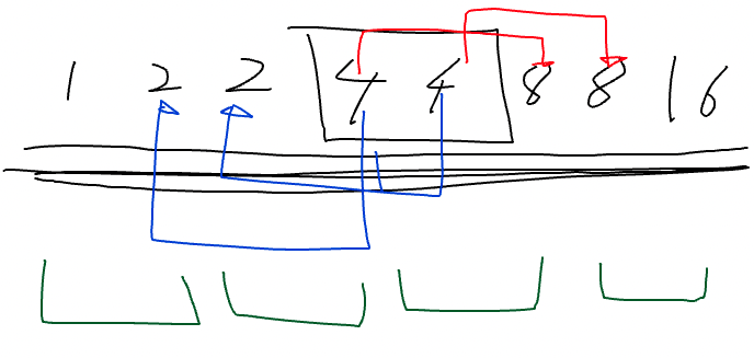 매칭이 초록색처럼 되어야 한다. (1,2) (2,4) (4,8) (8,16) 근데 정렬 안하고 순회하게 되어서 4,4가 먼저 들어온다 치자. 어떻게 매칭할건가? 나보다 작은거부터 매칭하면 파란색으로 매칭돼서 잘못돼버리고 큰거부터 보면 빨간색처럼 매칭된다.