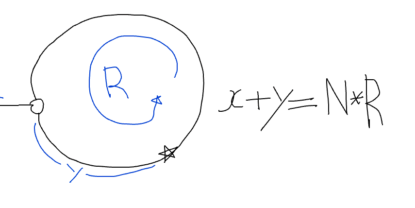 그니까 fast가 움직인 거리는 2(x+y)이기도 하고 x + y + N*R이기도 한것이다. 2(x+y) = x + y + N*R