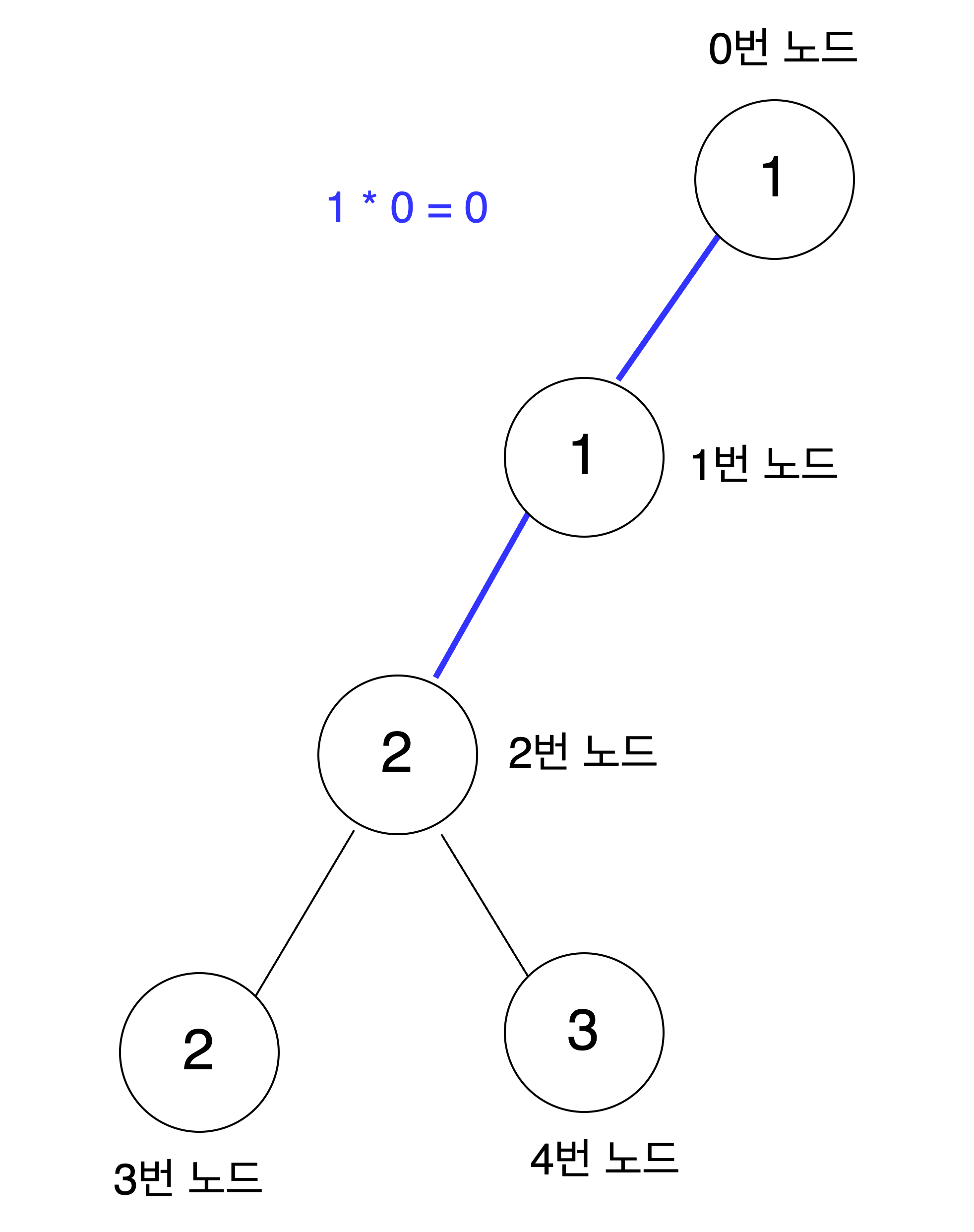 1 다음으로 작은값은 2다. 2번 트리에는 1개의 2가 있고 0번 노드와 1번 노드가 이어진 트리에는 2가 0개 있으므로 양끝이 2인 good path는 1 * 0 = 0개 추가된다.