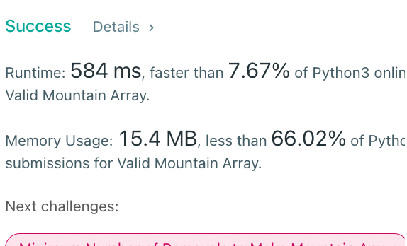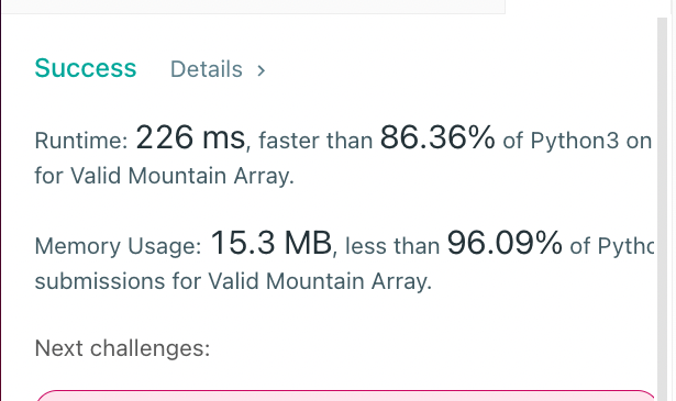 peak가 없으면 i가 len(arr)까지 올라가있을거다. 또 올라가는 구간이 최소 하나는 있어야돼서 i가 1개 이상은 증가되어 있어야 한다.