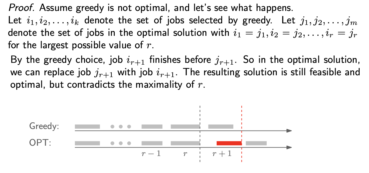 r + 1도 greedy 알고리즘의 인터벌이 먼저끝나므로 OPT r+1을 GREEDY r+1로 대체해도 옵티멀이 돼서 모순이라는 것이다.